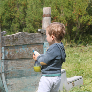 In midwinter when the feeling of juicy grapes being squashed between tiny toes is but a distant memory, the old grape press becomes a boat, sailing on the stormy waters of the sleepy fish pond nearby.