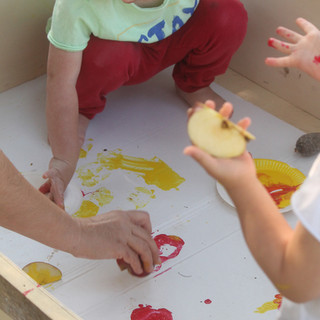 Today, in full seasonal swing, there is a table of autumnal curiosities: walnuts, dry leaves, ripe pine cones and chestnuts. Once the children have had a feel of them it's time to use them to make art, in shades of red, yellow and orange.