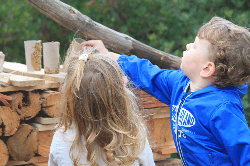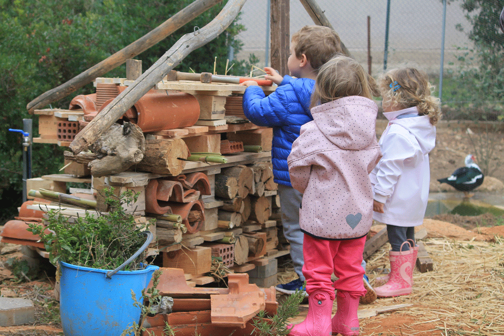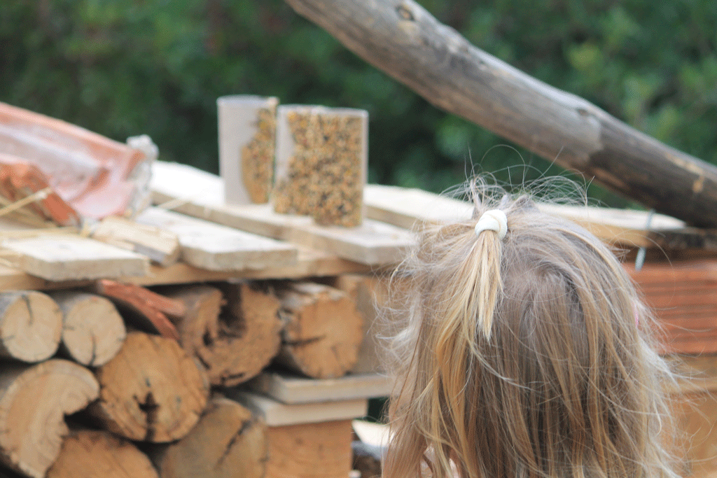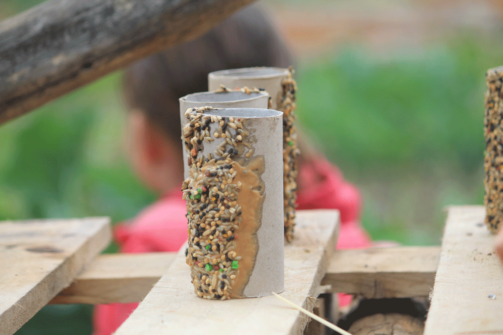 On Monday the children arrived to find the main structure in place and with remarks such as “this bit of wood is the bedroom”, “now I’ll put in the living room and then the kitchen”, let’s make them a cinema and a playground”… they have been filling in the gaps. Using tiles, perforated bricks, bamboo sticks, straw, sticks and stones of all shapes and sizes they have created ideal nesting places for a variety of garden friends. Chiefly, garden friends are predators of garden foe, from aphid-eating ladybirds, to caterpillar-chomping wasps, to the snail-scoffing song- thrush, we begin to understand predator-prey cycles and how important it is to maintain that balance. The highlight has been the attic where we hope to attract some birds. The children used old toilet rolls dipped in sticky peanut butter and then rolled in seeds, making a bird-feeder. They placed them in the hollow roof and now await their customers.