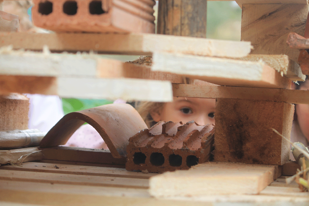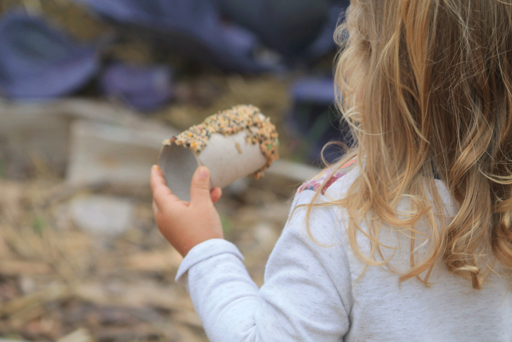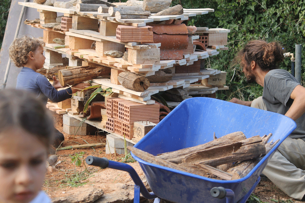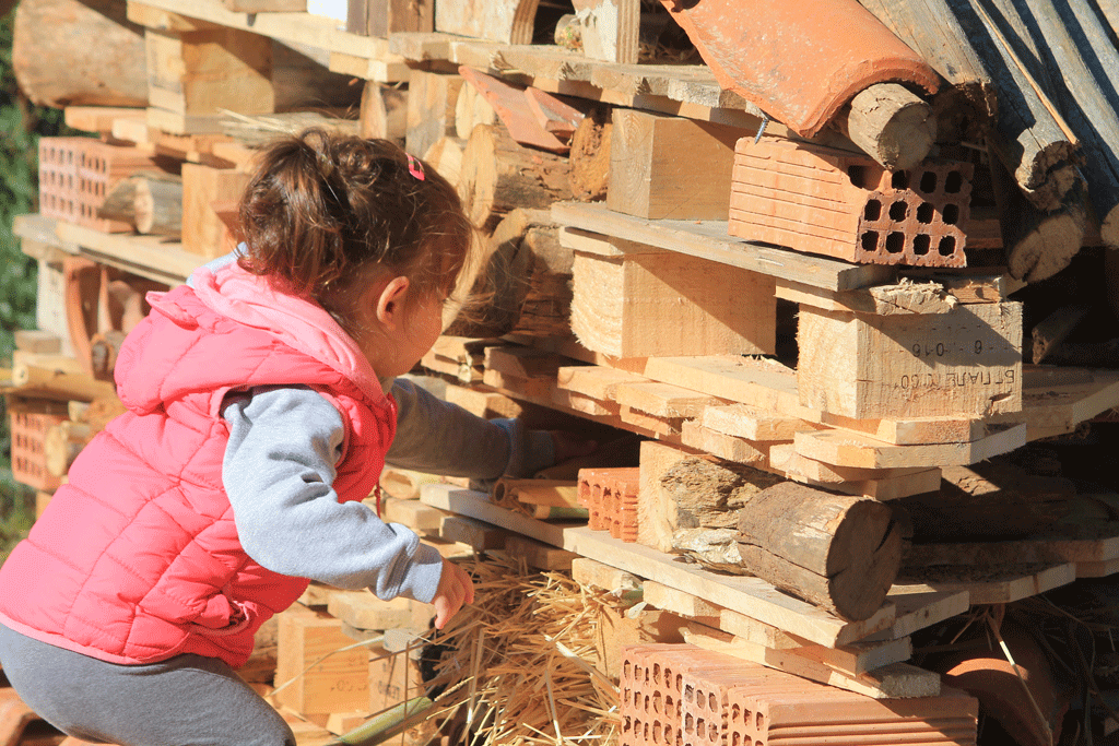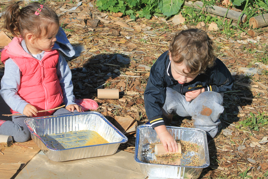 On Monday the children arrived to find the main structure in place and with remarks such as “this bit of wood is the bedroom”, “now I’ll put in the living room and then the kitchen”, let’s make them a cinema and a playground”… they have been filling in the gaps. Using tiles, perforated bricks, bamboo sticks, straw, sticks and stones of all shapes and sizes they have created ideal nesting places for a variety of garden friends. Chiefly, garden friends are predators of garden foe, from aphid-eating ladybirds, to caterpillar-chomping wasps, to the snail-scoffing song- thrush, we begin to understand predator-prey cycles and how important it is to maintain that balance. The highlight has been the attic where we hope to attract some birds. The children used old toilet rolls dipped in sticky peanut butter and then rolled in seeds, making a bird-feeder. They placed them in the hollow roof and now await their customers.