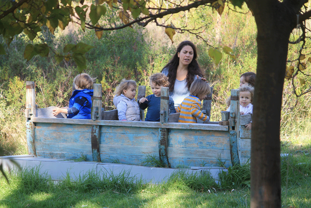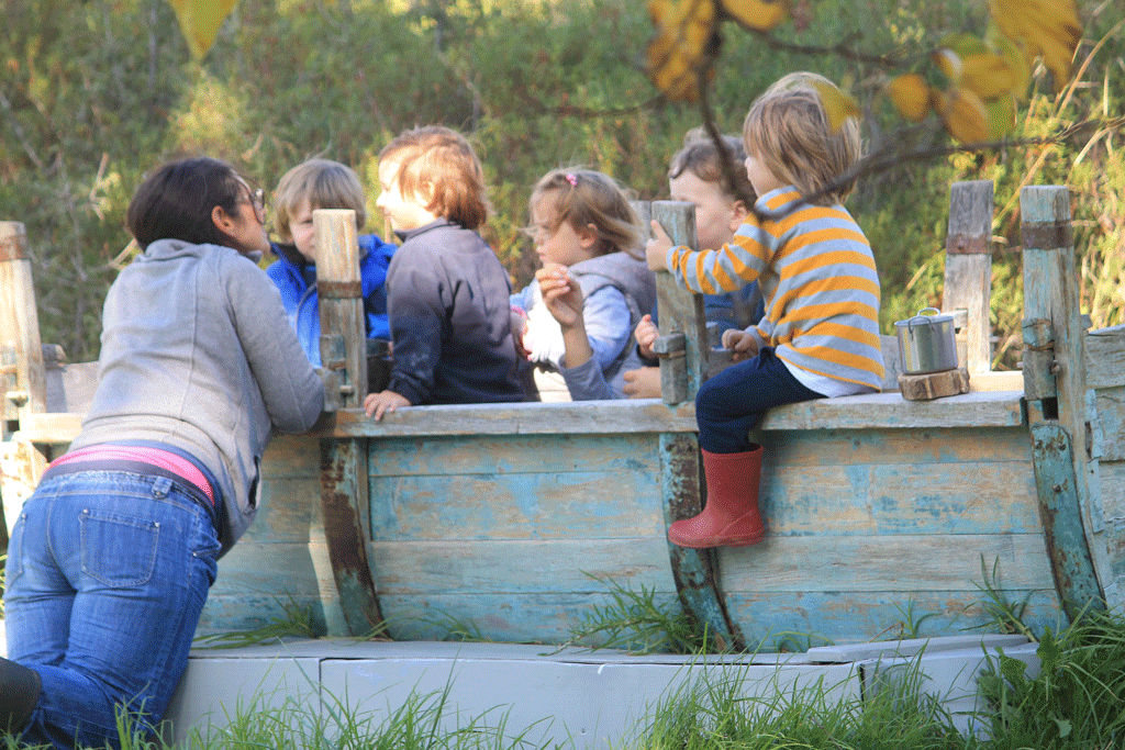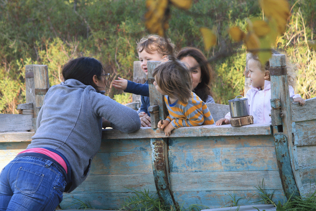 One of the teachers begins to circle them pretending to be a shark, any dawdlers scamper to safety and scramble in. They are fishermen at sea and they shout to the shark to go away, but as it approaches a little boy shouts “come, I have some fish for you” and the others join in throwing imaginary fish overboard. The shark is grateful and drifts off happily, the fishermen get back to their work.