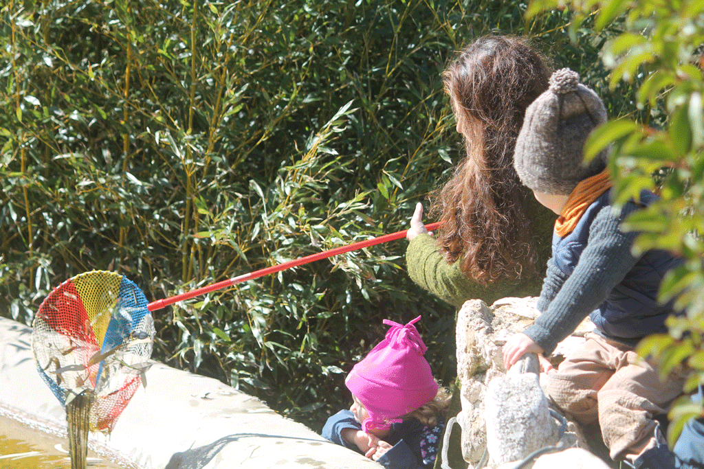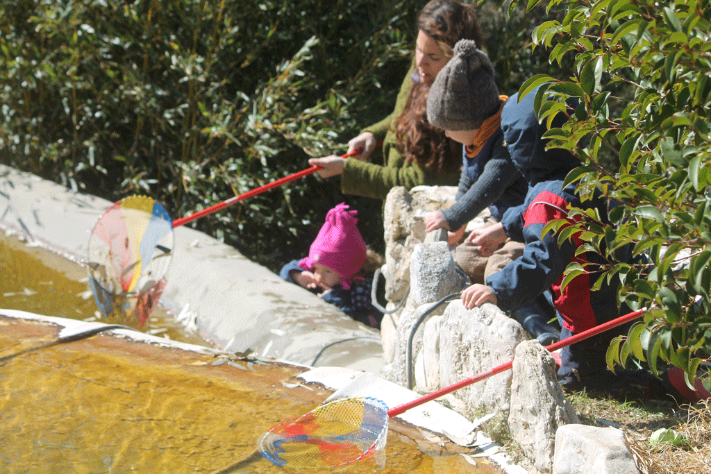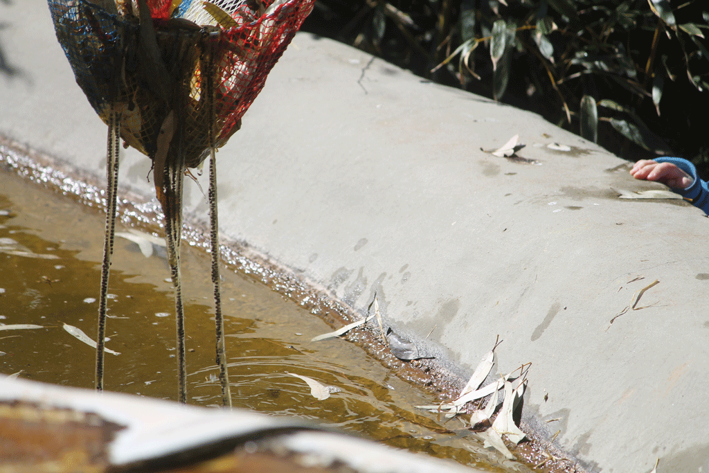 The ponds are strewn with eucalyptus leaves. The children get out their fishing nets to drag them out. In doing so, someone notices strands of something else floating in the water. Everyone gathers round to see the slimy threads being fished out and get a better look.