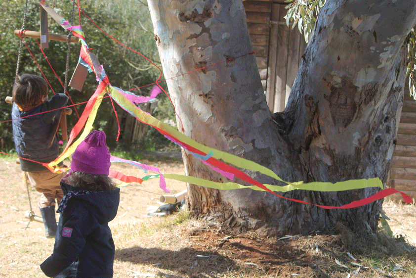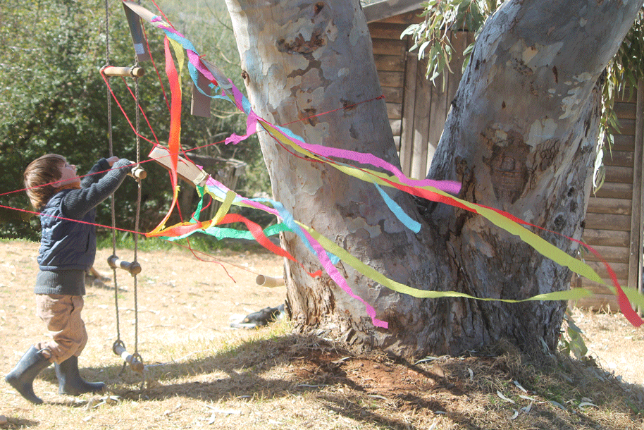 The kites are tied up on the rope ladder hanging from the eucalyptus tree, their tails fluttering in the wind.